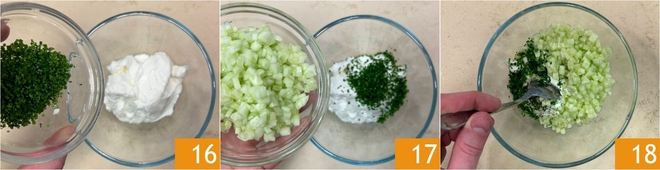 Geben Sie den griechischen Joghurt in eine Schüssel, dann fügen Sie die Gurke 16 und den Schnittlauch 17 hinzu, Salz und Pfeffer. Mischen Sie alles, um es zu vermengen 18.