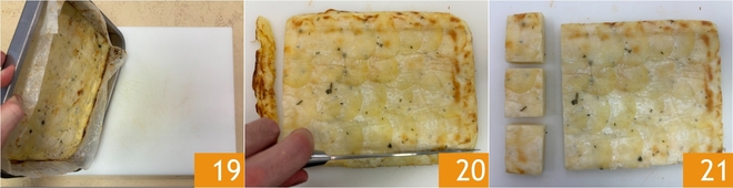 Nach der Ruhezeit stürzen Sie die Kartoffeln auf einen Teller 19, schneiden Sie die Ränder ab 20 und schneiden Sie sie in etwa 5 cm große Würfel 21.