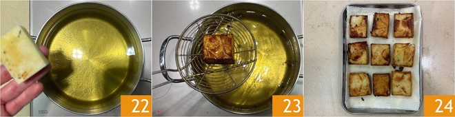 Erhitzen Sie das Pflanzenöl auf 180°, dann tauchen Sie 1-2 Würfel gleichzeitig mit einem Schaumlöffel ein 22 und frittieren Sie sie bis zur Goldbraunheit. Abtropfen lassen 23 und auf Küchenpapier legen 24.