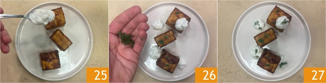 Richten Sie die Würfel mit kleinen Tupfen Tzatziki-Sauce 25, Maldon-Salz und ein paar Majoranblättern 26 an. Ihr Kartoffelpavé mit Tzatziki-Sauce ist servierbereit 27!