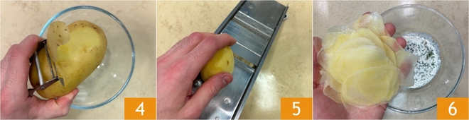 Schälen Sie die Kartoffeln 4 und schneiden Sie sie mit einem Gemüsehobel dünn 5; Sie sollten Scheiben mit einer Dicke von 1 mm erhalten. Geben Sie die Kartoffeln in die Schüssel mit der Sahne 6.