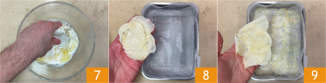 Mischen Sie vorsichtig mit den Händen, um sie gleichmäßig zu überziehen 7. Legen Sie eine 20x25 cm große Backform mit Backpapier aus und schichten Sie die Kartoffeln, indem Sie sie gut zusammendrücken und glattstreichen 8 9.