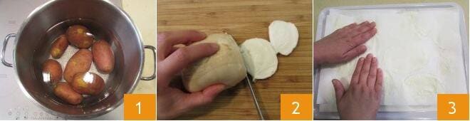 Um die Kartoffel-Streuselkuchen zuzubereiten, kochen Sie zuerst die Kartoffeln mit Schale, beginnend mit kaltem Wasser 1, und kochen Sie sie 30-40 Minuten ab dem Siedepunkt, oder bis sie weich sind, wenn Sie mit einer Gabel hineinstechen. Schneiden Sie den geräucherten Büffelmozzarella in Scheiben 2, legen Sie die Scheiben auf ein mit Küchenpapier ausgelegtes Tablett und decken Sie sie mit einem weiteren Blatt Papier ab. Drücken Sie dann leicht mit den Händen 3, um sie gut zu pressen. Lassen Sie die Mozzarella so 20 Minuten ruhen, damit er gut trocknen kann.