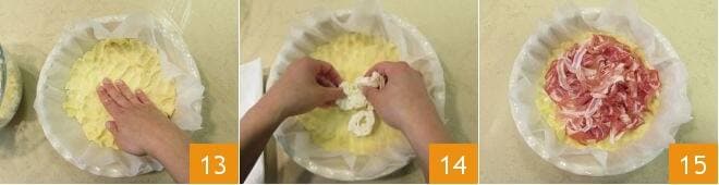 Drücken Sie den Teig mit den Fingern fest 13. Legen Sie die in grobe Stücke zerteilten Mozzarellascheiben 14 und den gerollten Speck 15 auf die Basis,