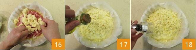 decken Sie dann alles mit dem restlichen Teig ab, den Sie gut andrücken sollten, um einen Deckel zu schaffen, den Sie grob mit den Händen krümeln 16 auf der obersten Schicht. Würzen Sie mit einem Schuss Öl 17 und Pfeffer 18.