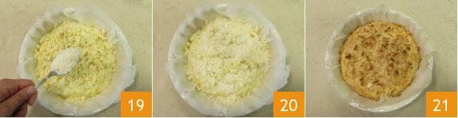 Fügen Sie den restlichen Parmesan auf der Oberfläche hinzu (19-20) und backen Sie im vorgeheizten Ofen bei 180° auf der mittleren Schiene für 25 Minuten. Nach den 25 Minuten backen Sie weiter für 8 Minuten mit dem Grill. Am Ende des Backens wird die herzhafte Streuselkuchen gut gebräunt sein, nehmen Sie sie aus dem Ofen, lassen Sie sie abkühlen 21 und servieren Sie sie dann in Scheiben geschnitten.