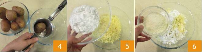 Sobald die Kartoffeln gekocht sind, pressen Sie sie mit einer Kartoffelpresse 4 und sammeln Sie das Püree in einer großen Schüssel, lassen Sie es abkühlen und fügen Sie dann die Stärke 5, die Hälfte des Parmesans 6 hinzu,