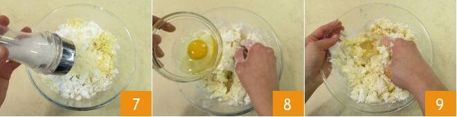das Salz 7, das ganze Ei 8 und verarbeiten Sie alles mit den Händen 9