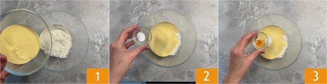 Um die Kartoffel- und Kräuterravioli mit Soße zuzubereiten, beginnt ihr mit dem frischen Teig: In einer Schüssel gebt das Mehl, den Hartweizengrieß 1, das Salz 2 und eine gute Prise Kurkuma 3 hinzu, die den Geschmack nicht stark beeinflussen wird, aber den Teig auch ohne Eier gelb färbt.