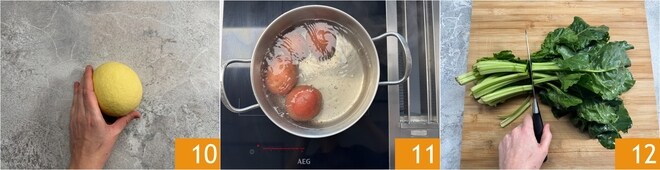 Sobald ihr eine glatte und gleichmäßige Kugel erhalten habt 10, deckt sie ab und lasst sie etwa 30 Minuten bei Raumtemperatur ruhen. In der Zwischenzeit widmet euch der Füllung: Gebt die gewaschenen Kartoffeln mit Schale in einen Topf mit kaltem Salzwasser und ab dem Kochen lasst sie etwa eine halbe Stunde kochen 11; ihr könnt die Garzeit mit den Zinken einer Gabel überprüfen. Reinigt die Kräuter: Entfernt den härtesten und zähsten Teil des Stiels 12.