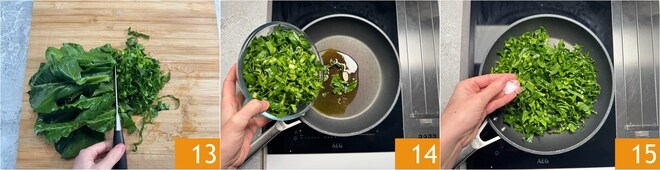 Schneidet die Blätter in Streifen 13 und gebt sie in eine Pfanne mit etwas Öl und einer geschälten Knoblauchzehe 14. Gebt eine leichte Prise Salz hinzu 15.