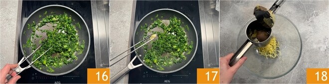 Lasst die Kräuter etwa 5 Minuten lang welken 16 und entfernt am Ende den Knoblauch 17. Zerdrückt die gekochten Kartoffeln in einer Schüssel 18.