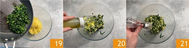 Fügt die sautierten Kräuter hinzu 19, etwas Öl 20 und würzt mit Salz und Pfeffer 21.