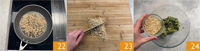 Röstet die Pinienkerne in der Pfanne 22, hackt sie 23 und fügt sie der Füllung hinzu 24.