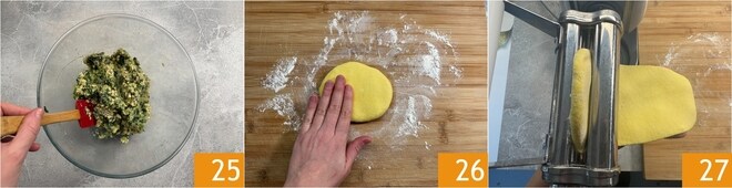 Zum Schluss gut vermischen 25. Holt euch den ausgeruhten Teig und trennt einen Teil ab. Drückt ihn leicht auf der bemehlten Arbeitsfläche 26 und rollt ihn dann mit der Nudelmaschine aus, beginnend mit der größten Dicke 27.
