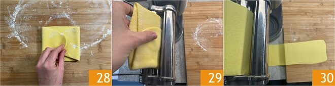 Nach diesem ersten Durchgang faltet den Teig auf sich selbst, um ihn rechteckig zu machen 28, und rollt ihn erneut auf der gleichen Dicke 29. Das macht den Teig widerstandsfähiger und die Form des Blattes gleichmäßiger. Fahrt fort, indem ihr ihn durch die Nudelmaschine führt und die Dicke schrittweise reduziert, bis zur vorletzten Stufe 30.