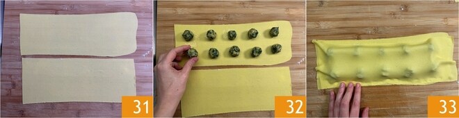 Teilt den Teig dann in 2 gleiche Teile 31 und verteilt auf einer der beiden kleine Füllungskugeln von je 7 g in regelmäßigem Abstand 32. Deckt dann mit dem anderen Blatt ab 33 und drückt die 2 Schichten gut aneinander und um die Füllung herum fest an.