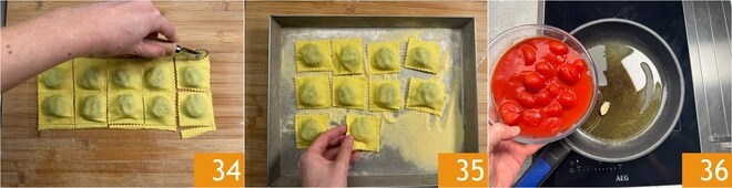 Schneidet mit einem gezahnten Rad quadratische Ravioli von 6 cm Seitenlänge 34 und sobald sie fertig sind, legt sie ohne Überlappung auf ein mit Grieß bestreutes Tablett 35. Ihr könnt die Soße zubereiten: In einer Pfanne mit etwas Öl und einer Knoblauchzehe gebt die Kirschtomaten mit ihrem Saft hinzu 36.