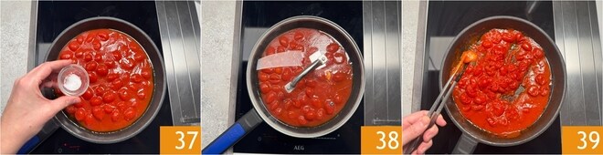 Salzt 37, rührt um, deckt mit einem Deckel ab 38 und lasst es etwa 30 Minuten kochen. Bei Bedarf entfernt den Deckel in den letzten 5 Minuten, um die Soße besser reduzieren zu lassen 38. Entfernt schließlich den Knoblauch 39.
