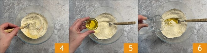 Vermischt alles mit einer Gabel 4 und fügt das Öl 5 und das Wasser 6 hinzu.
