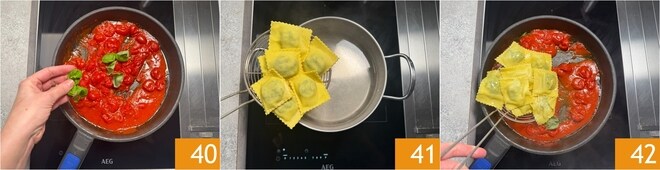 Aromatisiert mit reichlich von Hand zerpflücktem Basilikum 40 und werft die Ravioli in kochendes Salzwasser 41. Kocht sie etwa 3 Minuten und hebt sie direkt in die Soße 42.