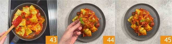 Mischt sie sehr vorsichtig, um sie zu würzen, ohne sie zu zerbrechen 43. Richtet sie mit ein paar weiteren Basilikumblättern 44 und einer Prise Pfeffer an. Eure Kartoffel- und Kräuterravioli mit Soße sind bereit, genossen zu werden 45!
