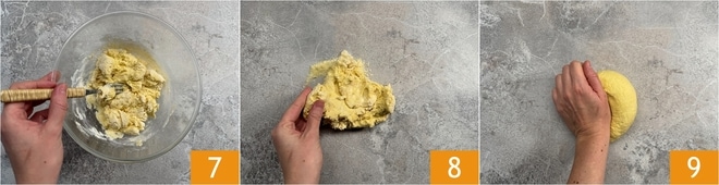 Arbeitet weiterhin mit der Gabel 7, um die Zutaten zu sammeln, dann übertragt den Teig auf die Arbeitsfläche 8 und knetet ihn ein paar Minuten von Hand weiter 9.