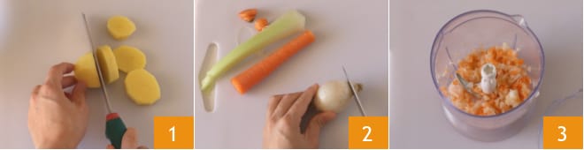 Um die Kartoffel- und Linsencreme mit Curry zuzubereiten, bereiten Sie zuerst die Gemüsebrühe zu, dann schälen und schneiden Sie die Kartoffeln in Scheiben 1. Putzen Sie den Sellerie, die Karotte und die Zwiebel 2 und schneiden Sie sie grob in Stücke, dann geben Sie sie in einen Mixer und hacken sie fein 3.