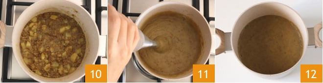 Nach dieser Zeit 10 pürieren Sie alles mit einem Stabmixer 11. Ihre Kartoffel- und Linsencreme mit Curry ist bereit, heiß serviert zu werden 12, mit etwas rohem Öl beträufelt!