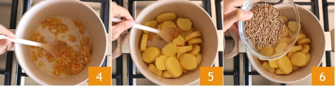 Geben Sie die gehackte Mischung zusammen mit dem Öl in einen Topf und braten Sie sie 2 Minuten lang an 4, dann fügen Sie die Kartoffeln hinzu und lassen sie etwa 3 Minuten lang anbraten, dabei gelegentlich umrühren 5. An diesem Punkt fügen Sie die Linsen hinzu, die Sie zuvor unter fließendem Wasser abgespült haben 6.