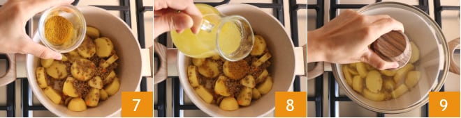 Würzen Sie mit Curry 7, salzen Sie und bedecken Sie es leicht mit der Gemüsebrühe 8. Kochen Sie bei mittlerer bis niedriger Hitze etwa 30-35 Minuten lang, wobei Sie gelegentlich umrühren 9.