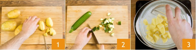 Um den Kartoffel-Zucchini-Salat zuzubereiten, beginnen Sie mit dem Gemüse. Schälen Sie die Kartoffeln und schneiden Sie sie in etwa zwei Zentimeter große Stücke 1, schneiden Sie die Zucchini in die gleiche Größe 2. Dämpfen Sie die Kartoffeln etwa zehn Minuten lang 3