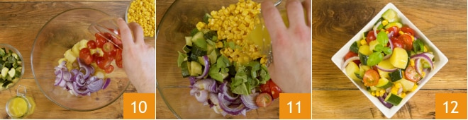 Zwiebeln und Kirschtomaten 10, Zucchini und Mais. Mit Salz würzen und mit einem Spritzer Öl beträufeln, einige Basilikumblätter zerreißen und vorsichtig mischen. Zum Schluss das Senf-Öl-Dressing hinzufügen und nochmals vorsichtig umrühren 11. Ihr Kartoffel-Zucchini-Salat ist fertig, garnieren Sie ihn mit etwas Basilikum und guten Appetit 12.