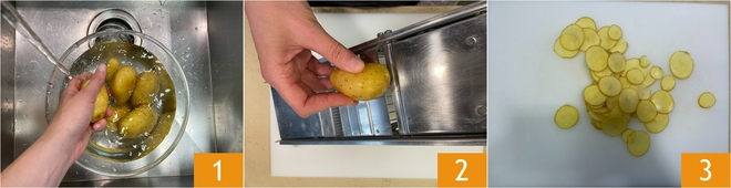 Um die Kartoffelchips zuzubereiten, waschen Sie zuerst die Kartoffeln gründlich, um alle Erdreste zu entfernen 1. Schneiden Sie mit einem Mandoline-Schneider 2 mm dicke Scheiben ab 2. Sobald Sie die erste Kartoffel geschnitten haben 3, geben Sie die Scheiben in eine Schüssel mit kaltem Wasser.