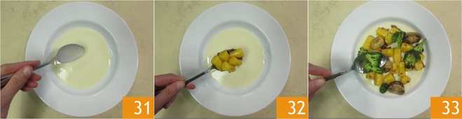 Sie sind bereit zum Anrichten: Gießen Sie die Mandelsahne auf den Boden des Tellers 31, dann fügen Sie die Gnocchi 32, die Pilze und den Brokkoli hinzu 33.