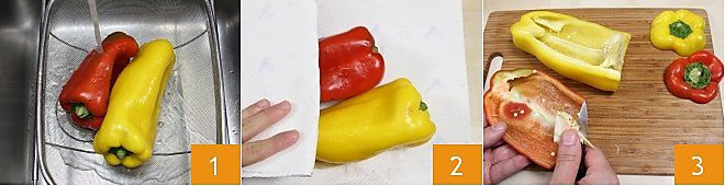 Um die Kartoffeln und Paprika zuzubereiten, beginnen Sie damit, die Paprika zu waschen 1, sie mit Küchenpapier abzutrocknen 2, dann halbieren und den grünen Stiel außen, die weißen Fasern 3 und die inneren Samen zu entfernen.