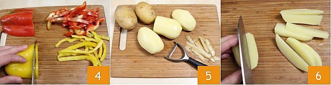 Schneiden Sie die Paprika in Streifen von etwa 1 cm bis 1 ½ cm Breite 4 und geben Sie sie in eine Schüssel. Schälen Sie die Kartoffeln 5 und schneiden Sie sie in nicht zu dünne Spalten (1 cm) 6.
