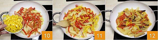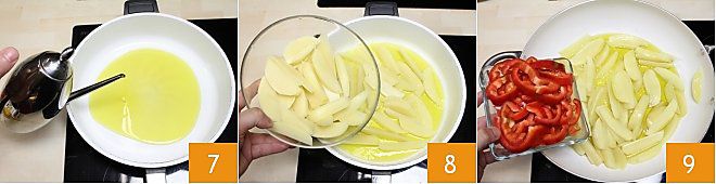 In einer großen Pfanne das extra native Olivenöl erhitzen 7, dann die Kartoffeln hinzufügen 8, die roten Paprika 9
