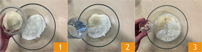 Gebt die Mehle in eine Schüssel 1 zusammen mit dem Wasser 2 und der zerbröselten Hefe 3.