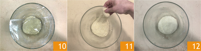 Deckt den Teig mit Frischhaltefolie 10 oder einem Tuch ab und lasst ihn 10 Minuten bei Raumtemperatur ruhen. Nach den 10 Minuten gebt ihr in derselben Schüssel die ersten Falten in den Teig, indem ihr ihn an den Seiten anhebt 11 und zur Mitte faltet; dann lasst ihn wieder 10 Minuten bei Raumtemperatur ruhen. Wiederholt diesen Vorgang insgesamt 4 Mal. Beim letzten Mal lasst ihr den Teig in einer Schüssel bei Raumtemperatur 12, abgedeckt mit Folie, etwa 2 Stunden gehen.