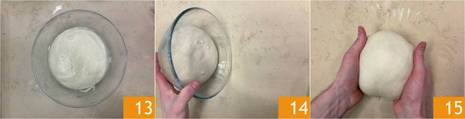 Nehmt den gegangenen Teig wieder heraus 13. Dreht ihn auf eine leicht mit Öl bestreute Arbeitsfläche 14 oder auf ein Brett und macht die letzten Falten 15.
