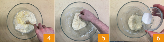 Sammelt die Zutaten mit einem Löffel 4, dann knetet ihr den Teig etwa 5 Minuten mit den Händen. Wenn ihr eine homogene Masse erreicht habt, verfahrt so: Hebt einen Teigrand von außen an und zieht ihn zur Mitte, bis sich die Glutenstruktur bildet. Anfangs wirkt der Teig sehr grob und rustikal 5. An diesem Punkt gebt ihr das Salz hinzu 6.