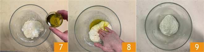 Gebt auch das Öl dazu 7 und arbeitet kräftig 8, bis beide Zutaten vollständig aufgenommen sind 9.