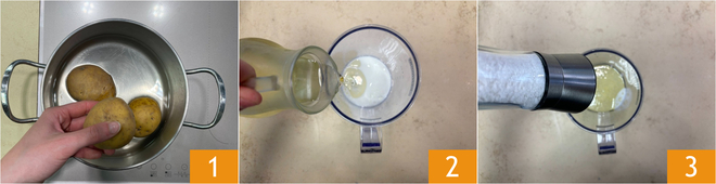 Um die Kartoffelspiralen zuzubereiten, kochen Sie zuerst die Kartoffeln, beginnend mit kaltem Wasser, für etwa 30-40 Minuten, bis sie weich sind 1. In der Zwischenzeit kümmern Sie sich um die Mayonnaise mit den Crusco-Paprika: Gießen Sie die Milch und das kalte Sonnenblumenöl in einen Krug 2, dann salzen Sie 3.