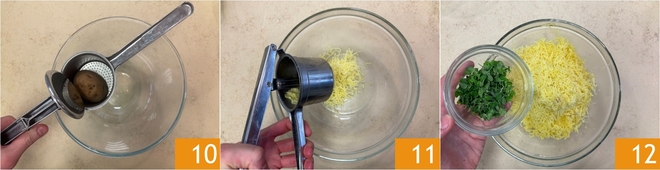 Gießen Sie die gekochten Kartoffeln ab, drücken Sie sie noch warm mit der Kartoffelpresse 10 und sammeln Sie das Püree in einer Schüssel 11. Würzen Sie mit den Blättchen frischer Majoran 12.