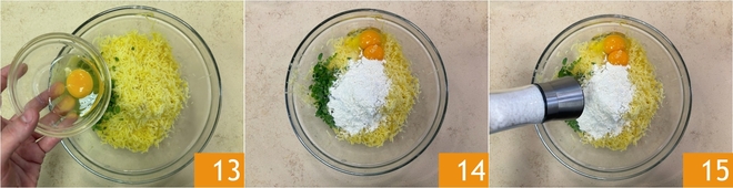 Fügen Sie das ganze Ei 13 und das Eigelb hinzu, dann das Mehl 14 und salzen Sie 15.