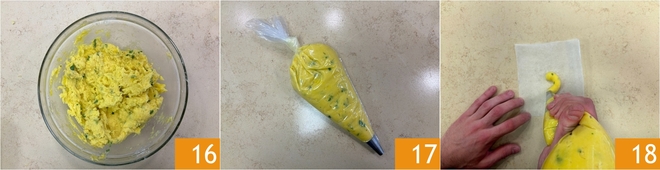 Mischen Sie die Masse, bis sie homogen ist 16, und geben Sie sie dann in einen Spritzbeutel mit einer Tülle von 12 oder 13 mm 17. Schneiden Sie Quadrate von 10x10 cm aus Backpapierblättern und drücken Sie die Masse von der Mitte aus 18.