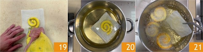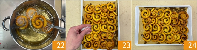 Sie müssen Spiralen formen 19. Erhitzen Sie das Sonnenblumenöl in einem kleinen Topf und sobald es 180°C erreicht hat, tauchen Sie die Backpapierblätter mit den Spiralen ein 20, entfernen Sie dann das Papier mit einer Zange 21. Frittieren Sie nur wenige Teile gleichzeitig, um zu verhindern, dass die Öltemperatur sinkt.