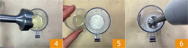 Tauchen Sie den Stabmixer ein 4 und mixen Sie mit mittlerer Geschwindigkeit, bis die Mischung eingedickt ist. Fügen Sie dann den Zitronensaft hinzu 5 und mixen Sie noch ein paar Sekunden 6.