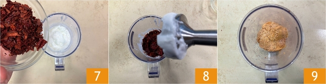 Fügen Sie die zerbröselten Crusco-Paprika hinzu 7, mixen Sie nochmal, um sie zu vermischen 8, und stellen Sie die fertige Mayonnaise beiseite 9.